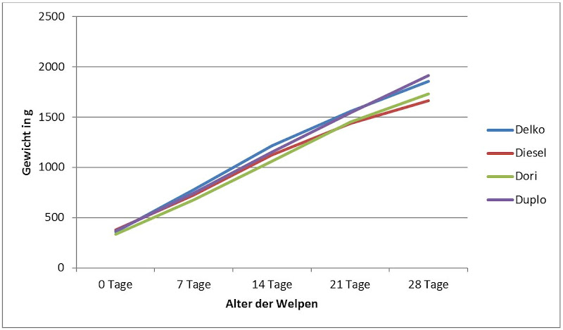 Alle nehmen stetig zu und sind absolut fit und munter. Aber ein bisschen trennen sich die Kurven der Welpen. Bin sehr gespannt, wie sich das weiter entwickelt: